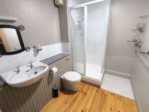 The bathroom is located off the main entrance hall and has a standalone shower unit.